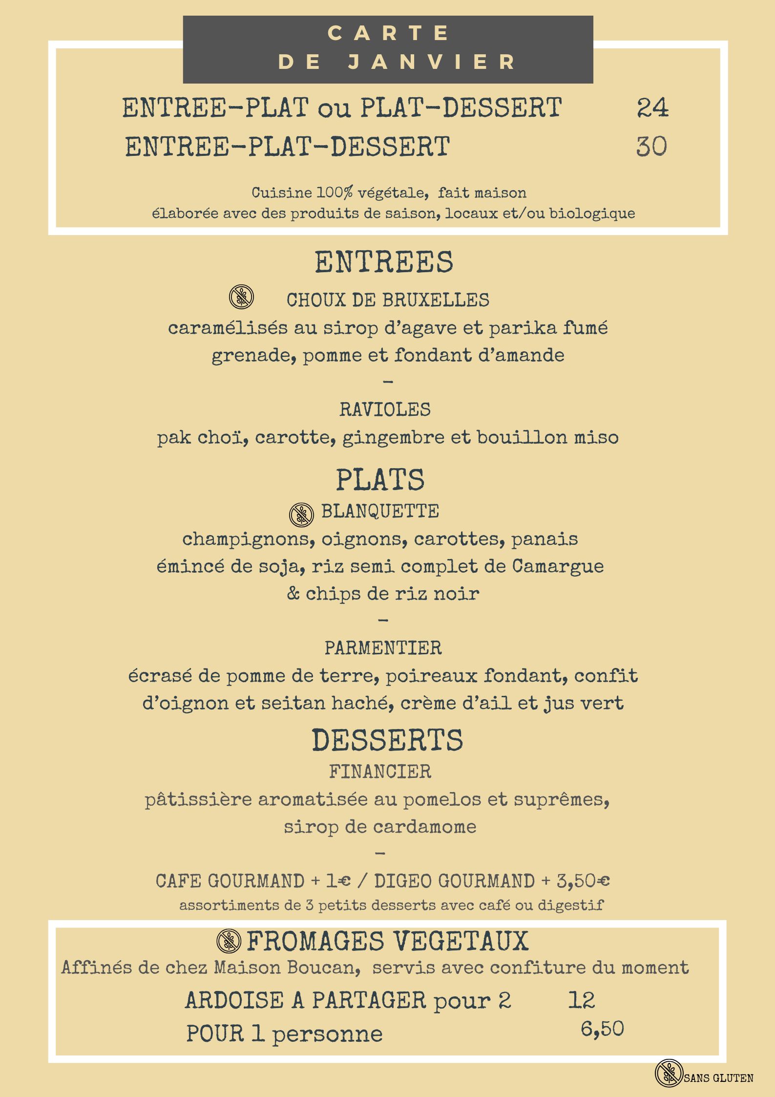 Des produits frais, de saison, local et/ou biologique; qui change chaque mois d’octobre à mai. L'expérience d’une cuisine végétale maison élaborée et gourmande , avec une approche globale tentant de répondre aux enjeux environnementaux et éthique; Le tout dans un cadre chaleureux !